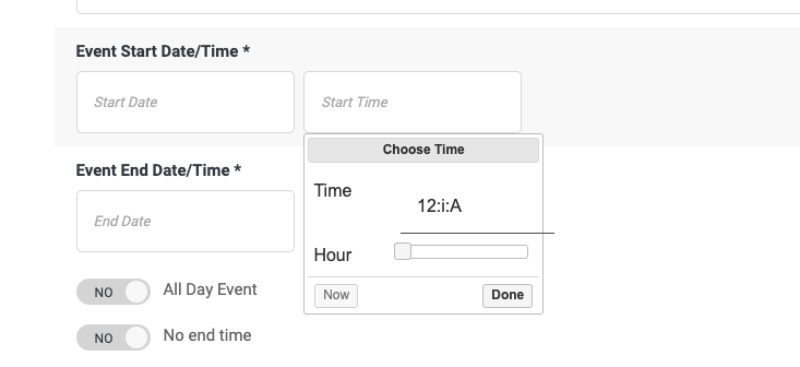 Here you can see the first screenshot is the FE form. The time when you click is showing an odd way to input time. I was expecting something similar to the way you input time when creating an event through the Back End.