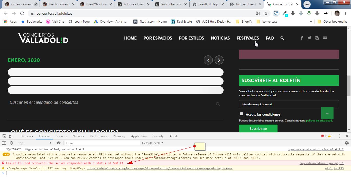 It seems your website have javascript errors caused by other plugins/theme. You can find and resolve them by following this guide. Once these javascript errors are fixed, eventon scripts will be able to run properly and will resolve your issue.