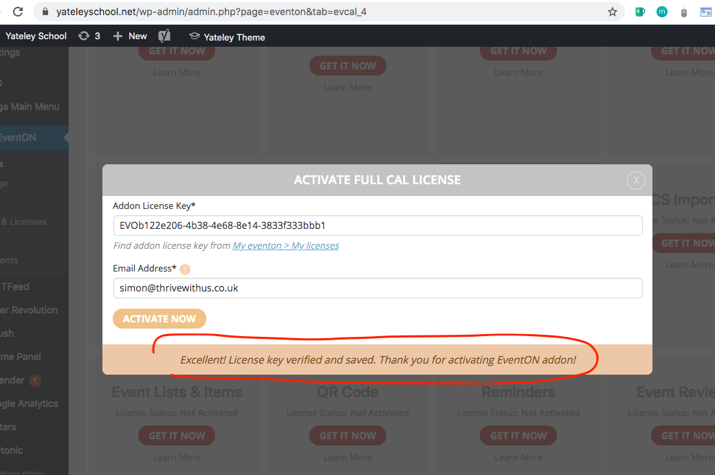 It is a bug in our license activation system emails with + sign does not get recognized. Please use email without + sign i have changed the email to adameventon@sercante.com only for the license. This information should reflect now in myeventon.com/my-account