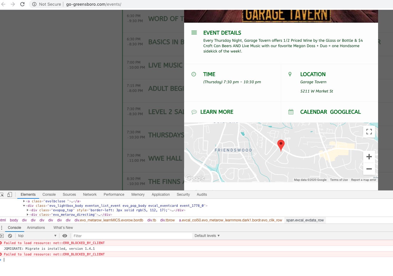 When I click on February 4 in the calendar, it pops up the events. When I click on an event, it still displays the event pop-up rather than sending to the user to the external link. I also see, when I inspect the element, that there are still .js errors that I think are related to your calendar plugin.