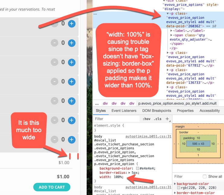 Here’s a snapshot of the Ticket Options where they are too wide. My recommended fix would to be just delete “width: 100%” since the p tag is already 100% width by default.