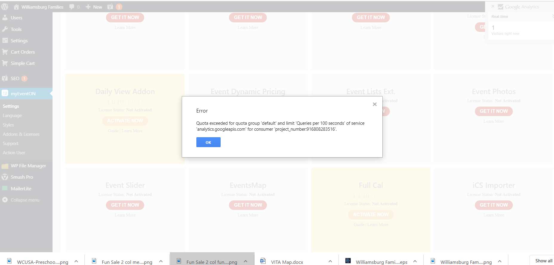 Also we are getting this error and it is kicking us off the site and our readers – it has happened to me over 5 times just today. My programmer said it had to do with our calendar and the google maps link. Please help us with this. This is the warning we get in a pop up screen: “Quota exceeded for quota group ‘default’ and limit ‘Queries per 100 seconds’ of service ‘analytics.googleapis.com’ for consumer ‘project_number:916808283516’.”