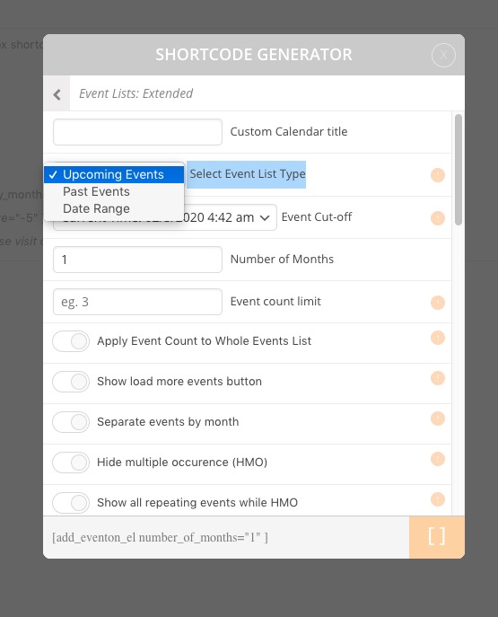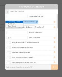 Please also note that you don’t need to use month_incre=”-12″ in Event Lists: Ext shortcode since it has Select Event List Type option: