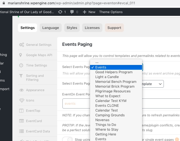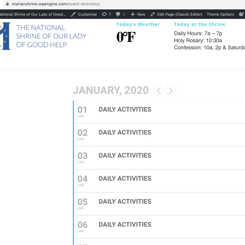 Do you want your main events page to be https://marianshrine.wpengine.com/events/ or https://marianshrine.wpengine.com/event-directory/?