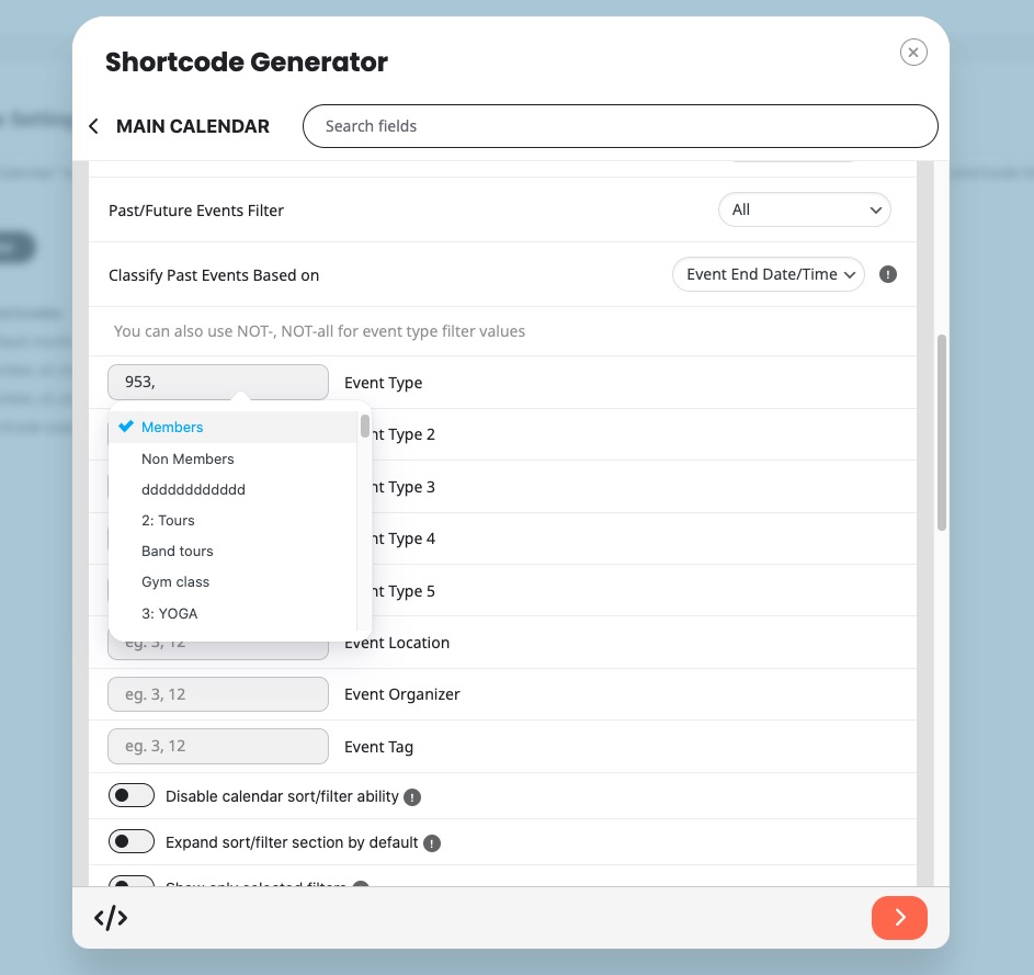I believe that you can just open Shortcode Generator and then select Event Type from the menu: