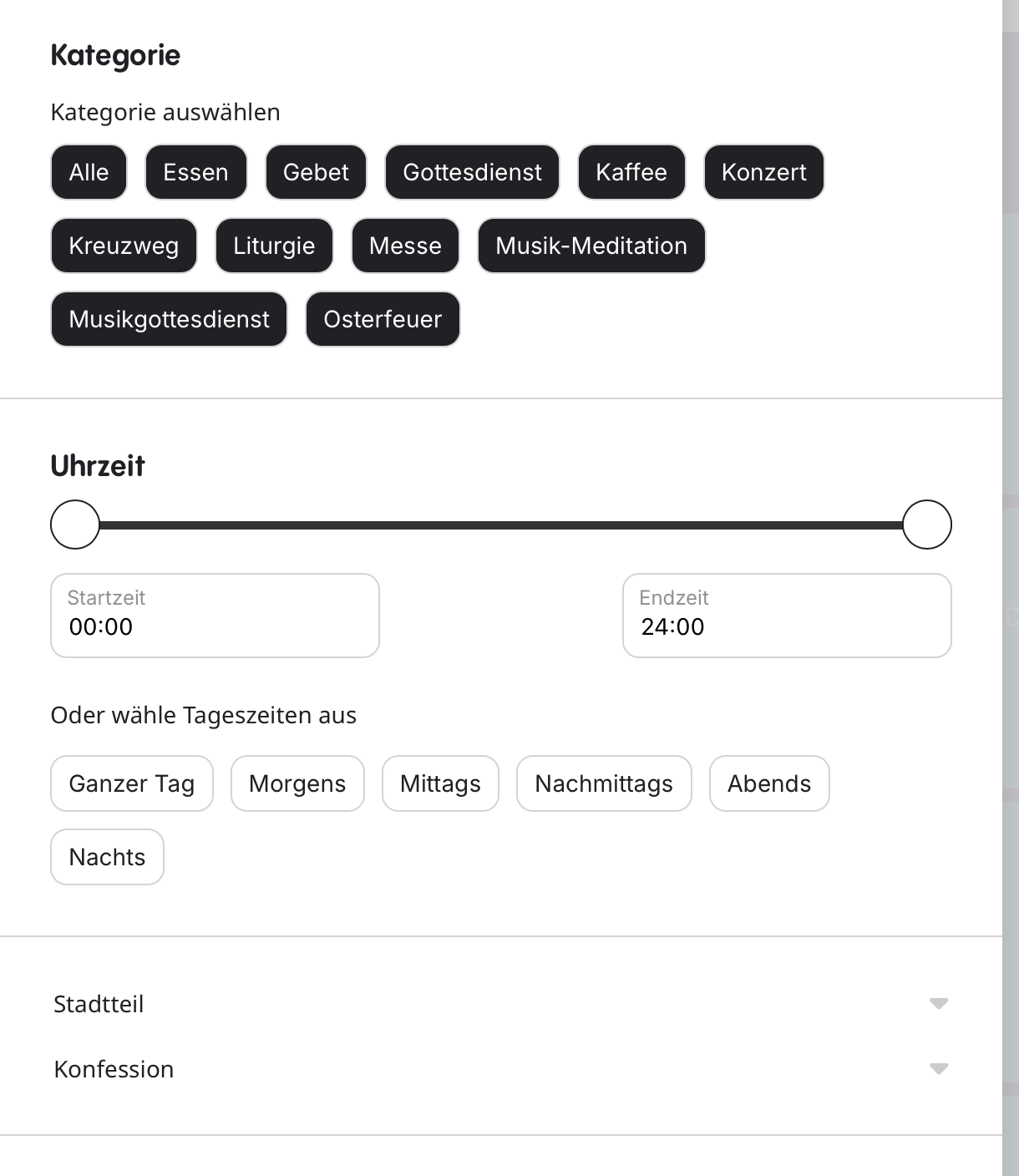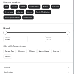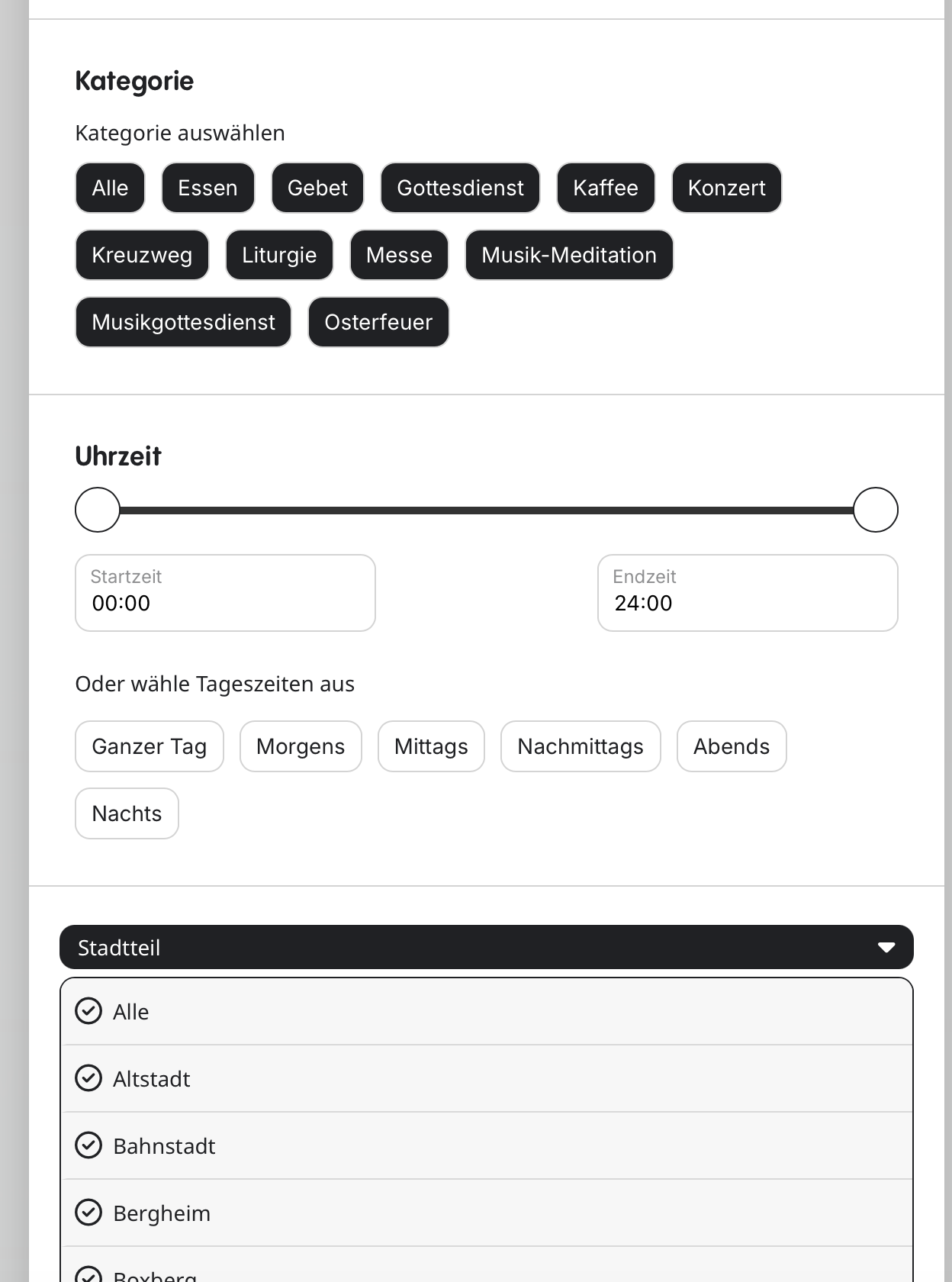 Screenshot attached. We are currently displaying 3 categories, here called Kategorie (the main categories on the top) and ”Stadtteil” and ”Konfession” at the bottom. We will at a third category too. However, some of the categories at the bottom we would display like the one on the top – each category as button and not as drop-down menu.