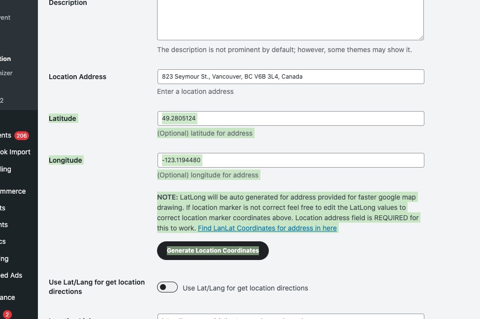 I went to EventON > Location > enabled Use Openstreetmap API to get geolocation coordinates. Now Lat/Long values can be generated: