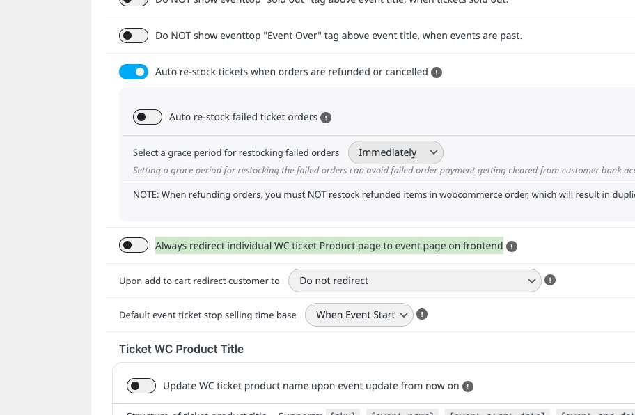 Could you go to EventON > Tickets > enable Always redirect individual WC ticket Product page to event page on frontend:
