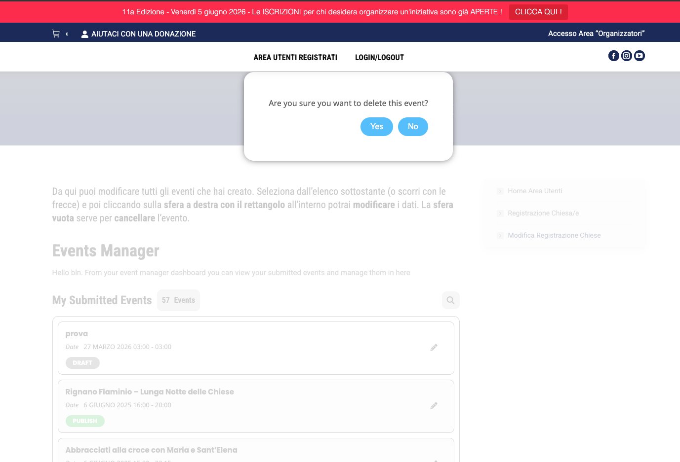 Hello, i think now is working. But now i have got another problem. Every time I go to the page to allow the user who created an event to edit it, the pop up I attached always appears. The page is on the ”user area”-> Modulo Registrazione Chiese/Evento -> Modifica Registrazione Chiese