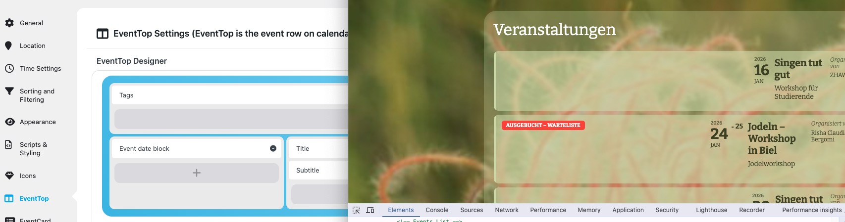 You can also change EventTop’s background by going to EventON > Appearance > EventTop > Background Color. If you don’t see any change, EventON > Scripts & Styling > turn off Write dynamic styles to header > save settings > turn on Write dynamic styles to header.