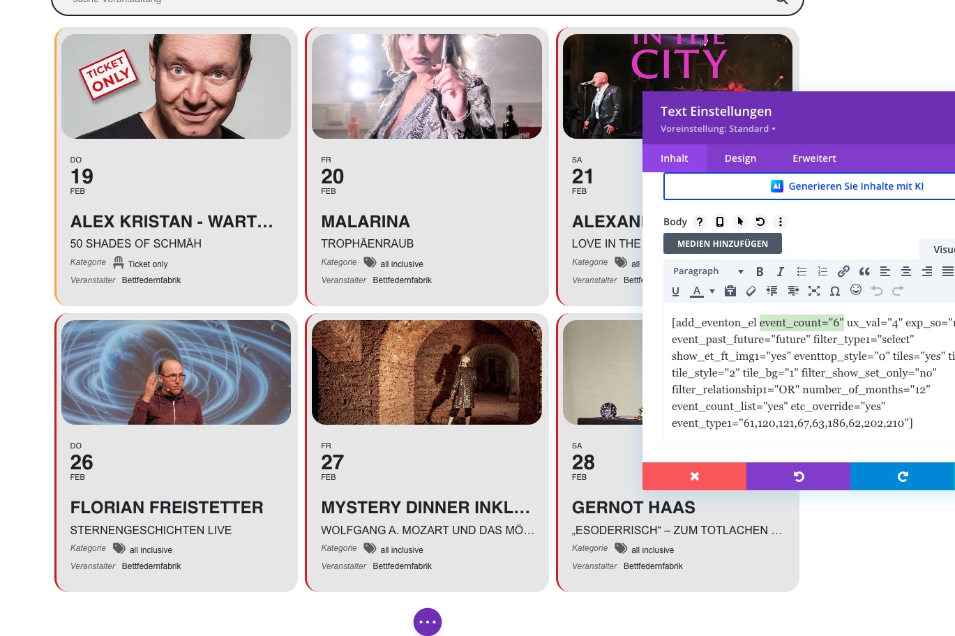 I just checked your website and it shows 6 events with 6 added to the shortcode: