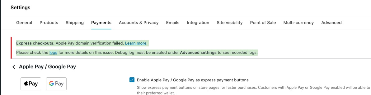 Also, why is Apple Pay not showing? It’s been selected as an option, but only Google Pay is there?