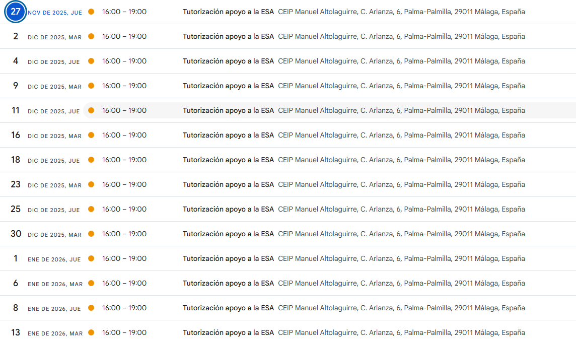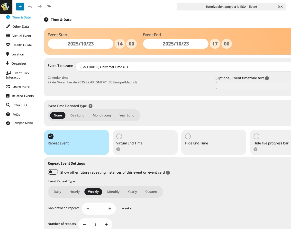 ”Tutorización apoyo a la ESA” is a repeating event with one repeat only: