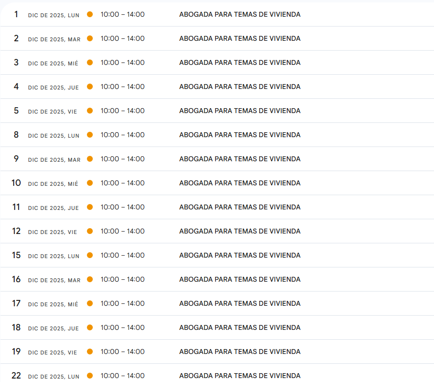 With event ”abogada para temas de vivienda” happens similar. No event in december and next months in https://www.proyectohogar.es/recursos, but there are a lot of events in Google Calendar in december, january, etc, as I attach