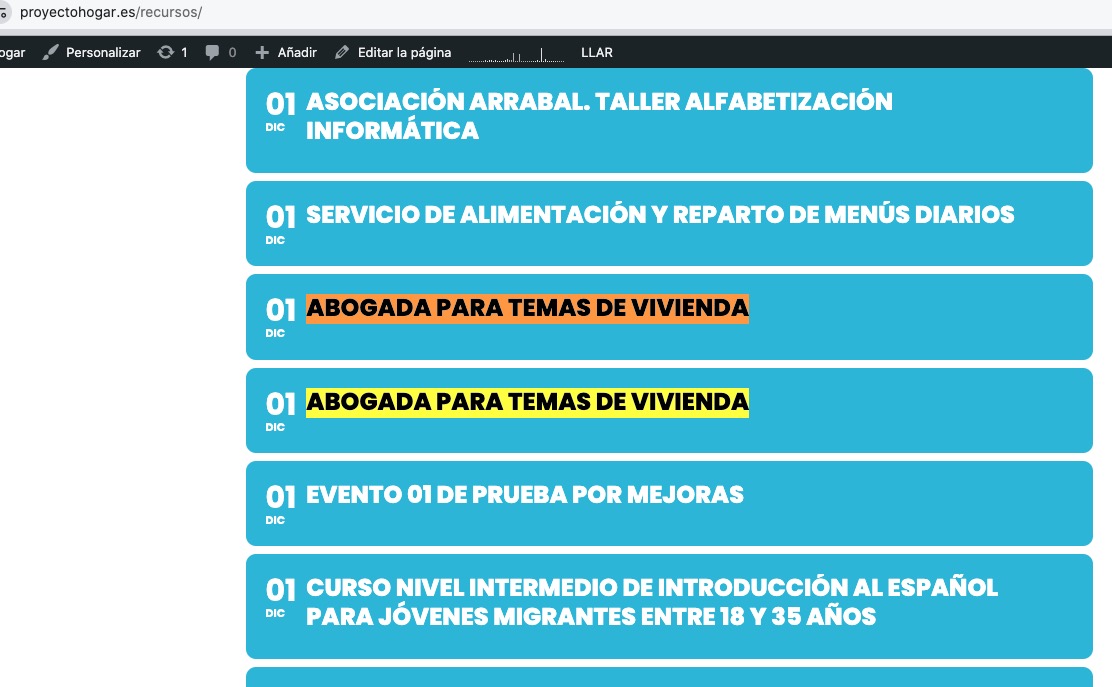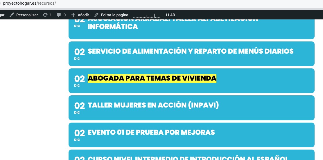 I want that all these events were shown in https://www.proyectohogar.es/recursos