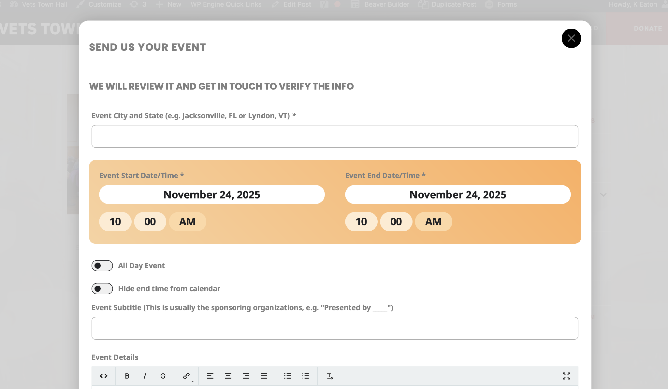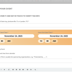 Here’s a screenshot of our actual form. I’m referring to ”Send us your event” and ”We’ll review it…”. I’ve tried going to the settings and changing the action user form header text and subheader text, but what I put in those fields doesn’t change what’s on our actual form.