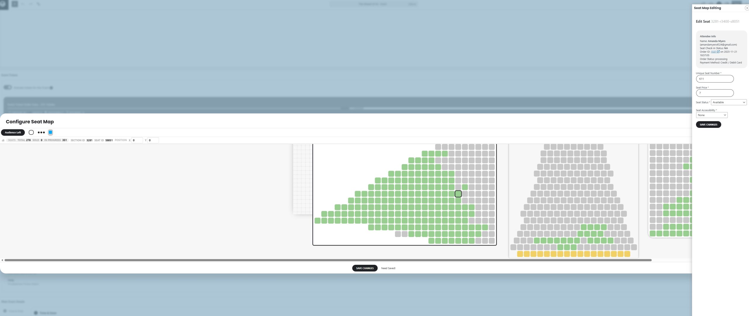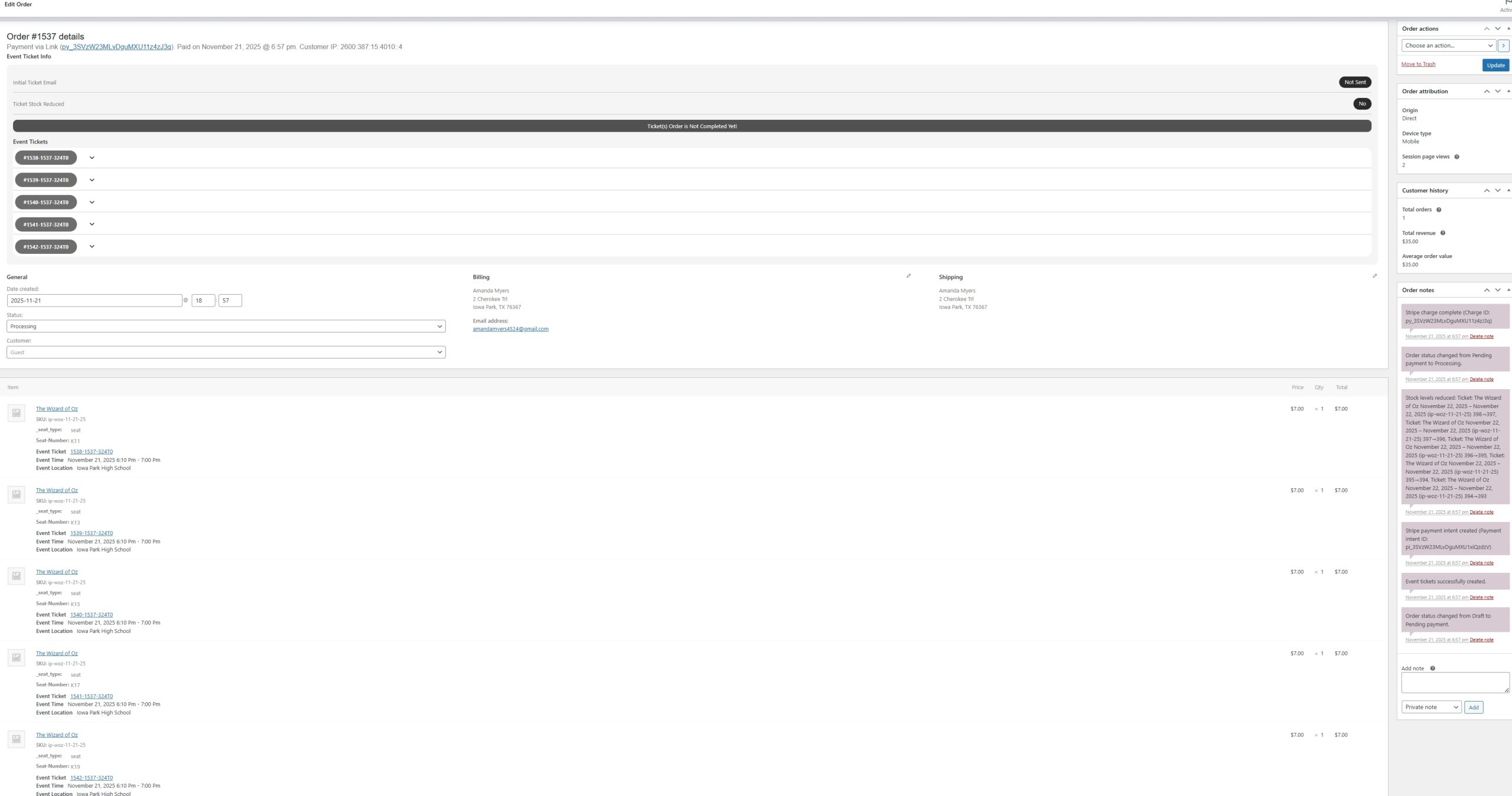 I attached the above screenshots to show what I’m seeing. The issue with not marking seats as unavailable is continuing. We have had fewer instances without Google Pay as a pmt option, but I grabbed this screenshot to show what I’m seeing. The order is purchased, it is not marked as completed (none are being marked even though I have all four options on in the ticket settings), I am immediately able to add the seats to my cart in a private browser (seconds after the order is made), and when I check the event seating is shows the seats available with the client information attached. I have had multiple local venues reach out with the success of these ticket sales, and as of yet I cannot tell them I can build them something because I cannot find a way to prevent double booking of seats.