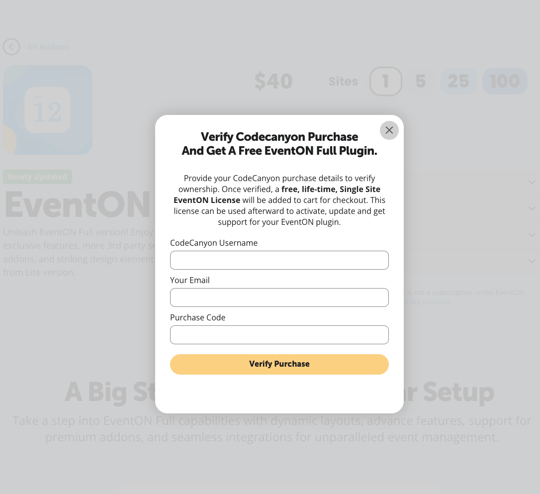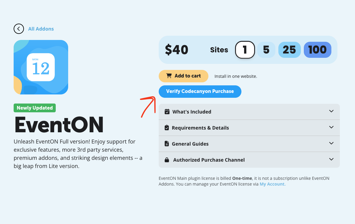 1. If you purchased eventON from codecanyon > Go to EventON Full page and verify your purchase to get a free copy of eventON latest version and move your purchase over to myeventon.com.