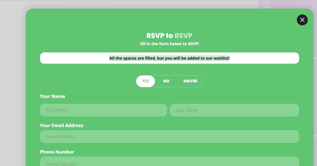”All the spaces are filled, but you will be added to our waitlist!” is always visible: