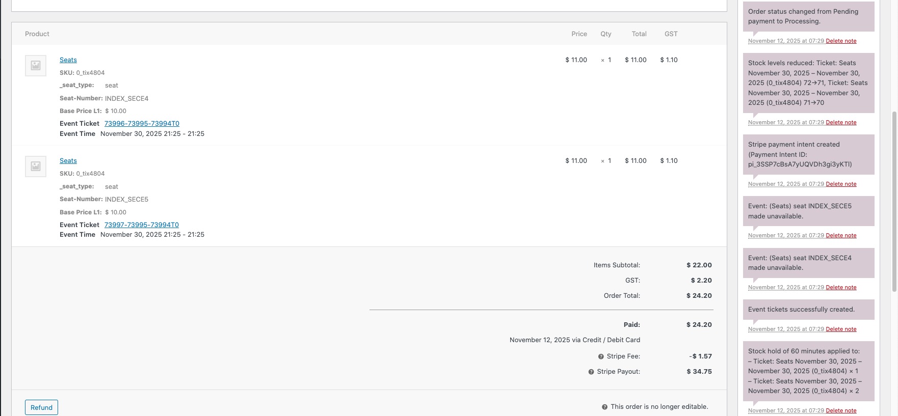 The only difference I can see looking at successful seats made orders unavailable versus the ones where it skips it is the starting message of “Order status changed from Draft to Pending payment.” I have had the autocomplete on and off, and tried everything I can think of but I can’t make it consistently make the seats purchased unavailable. This has caused a lot of having to communicate with clients and reserve other seats for them. And I’m scared to check for new orders. We’ve turned it off until we can get this fixed, but would really like to have it working so the parents and community can buy tickets without the headache,