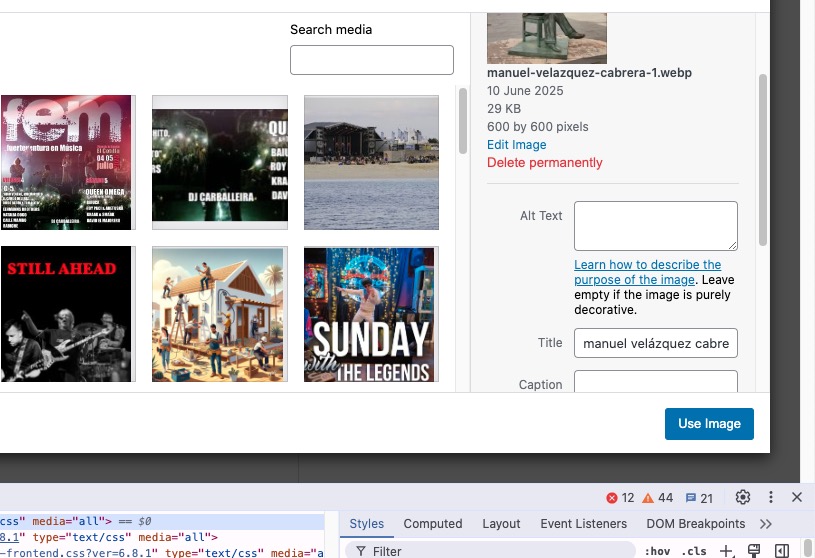 This is v2.5.1 using “Choose an Image” from the existing images, there is no “use image” or “insert image” button showing on my site after the upload.