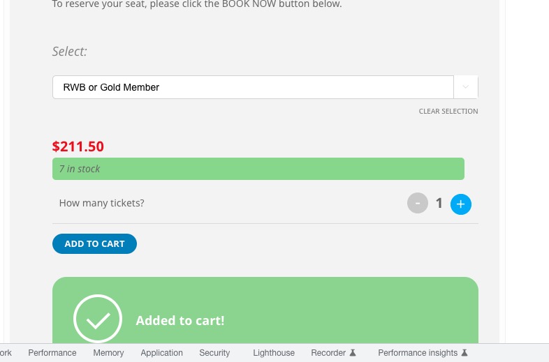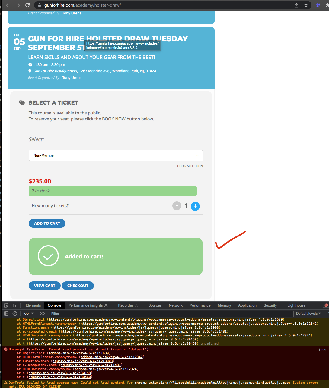 When someone tries to book an event and selects add to cart, the animation that appears when processing never stops. There is no confirmation that an item was added to the cart. If you scroll up and click on the cart, you will see the item, but the animation never ends.