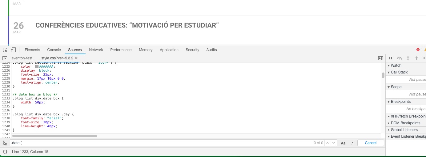 1. Please remove .date style from https://copia.incaciutat.com/wp-admin/admin.php?page=rt_styling_options > Custom CSS. The same with font. Please remove this style: