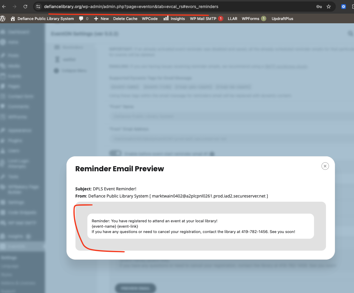 This morning I received two event reminders from EventOn to my inbox (I am not registered for any of our events and do not usually receive these.) I noticed that the reminders did not include in the event name/time/date. I will attach a picture.