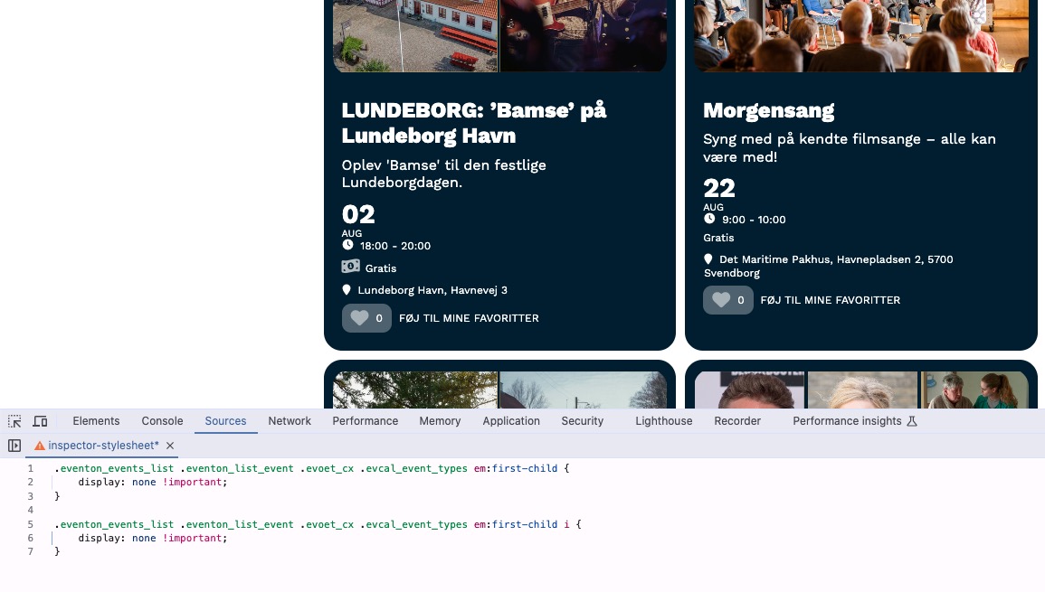 Here is a link to the calendar where you can see the issue on the first event, “LUNDEBORG: Bamse på Lundeborg Havn”. Forthis event, I am using Event Type to represent the price in the EventTop, and I want the money icon to replace the “Event Type” text entirely, making it unnecessary. https://svendfilmdage.dk/program-2025/