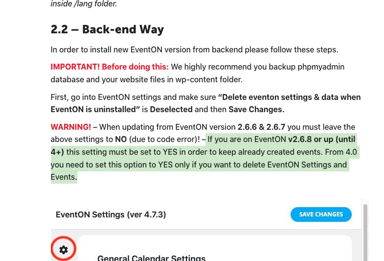 To update eventon to latest version: If you are unable to do autoupdate, you can go to codecanyon your account > download and get the latest eventon version as zip file. Then you can go to your website > make sure “Delete eventon settings & data when EventON is uninstalled” is Deslected from eventon settings, delete old eventon, install new one and activate. This link will further explain the process it. Also you can follow us on twitter to get real-time announcements on updates!