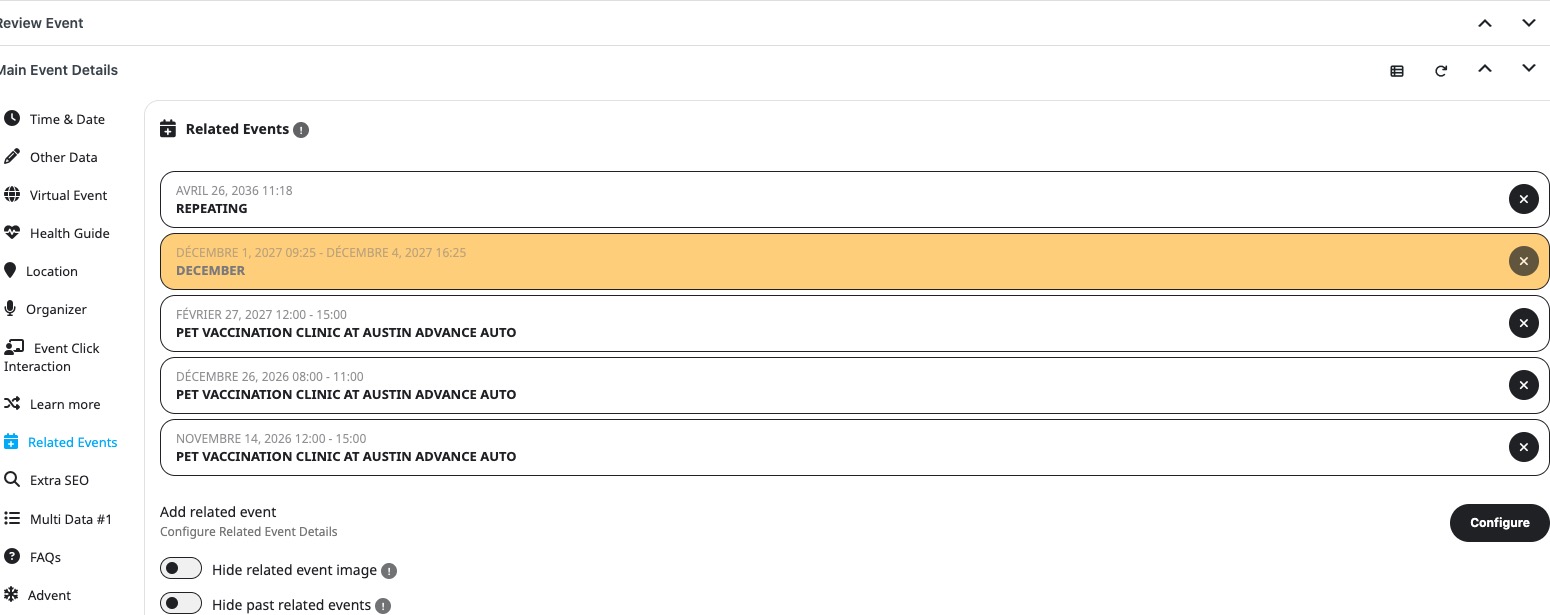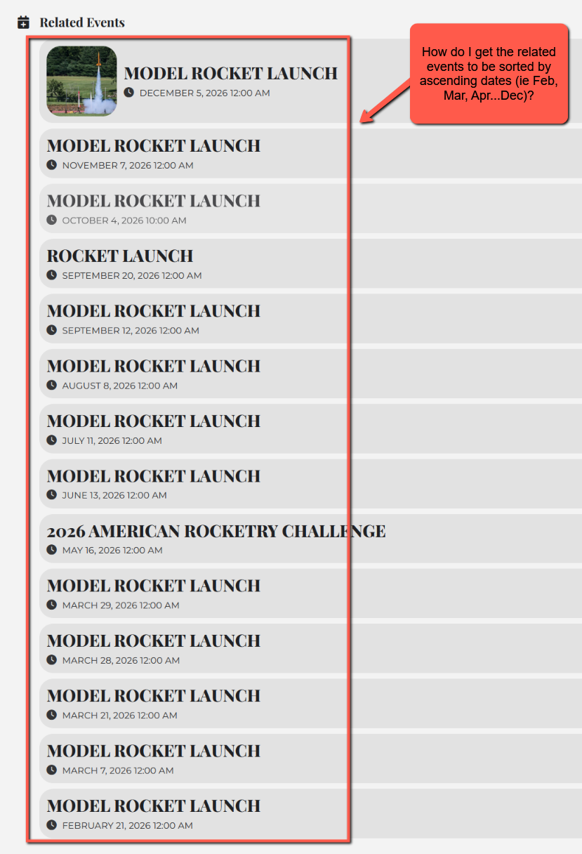 How do I get the related events to be sorted by ascending dates (ie Dec 2025, Jan 2026, Mar 2026, etc)?