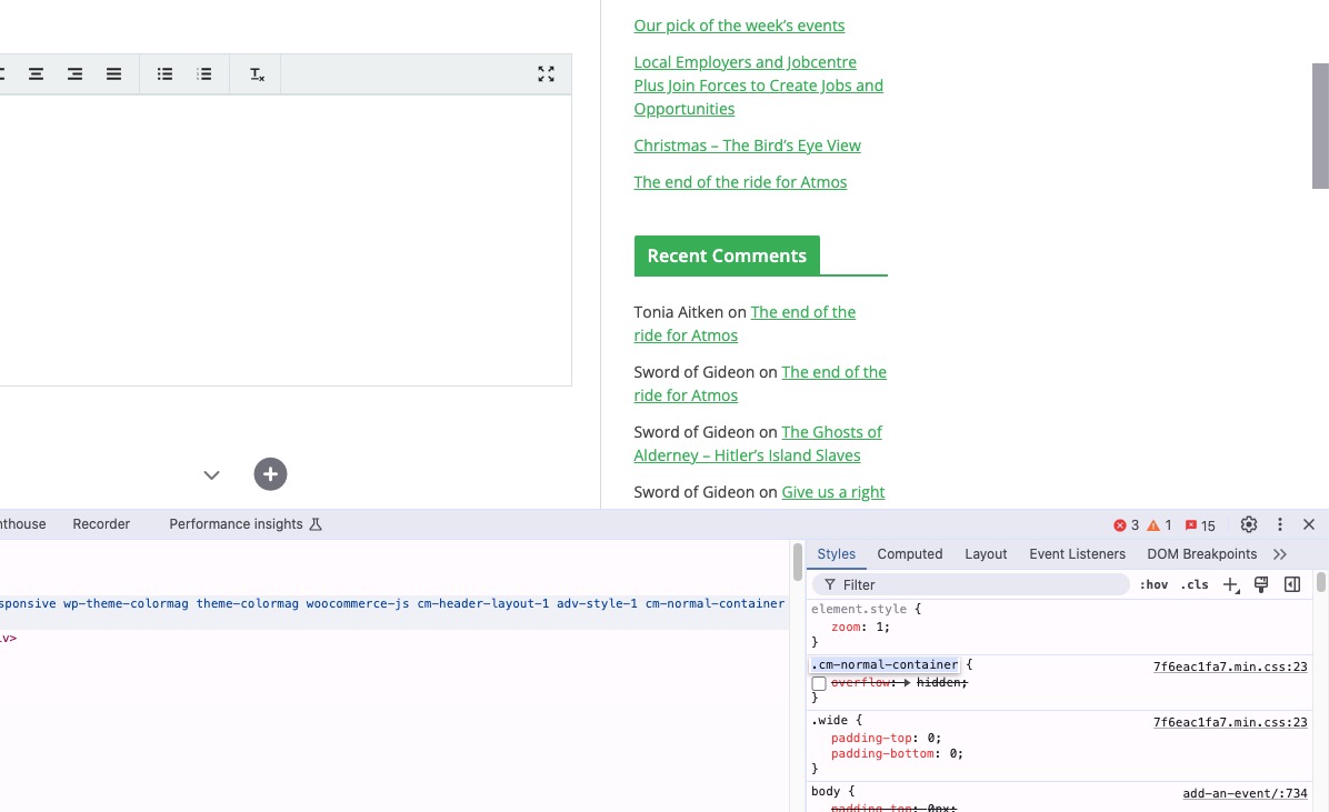 Two: The Lightbox pop-up window formatting has gone wrong with formatting from the right hand side. Oddly the hosting page with the add an event button also breaks the screen scrolling abilty.